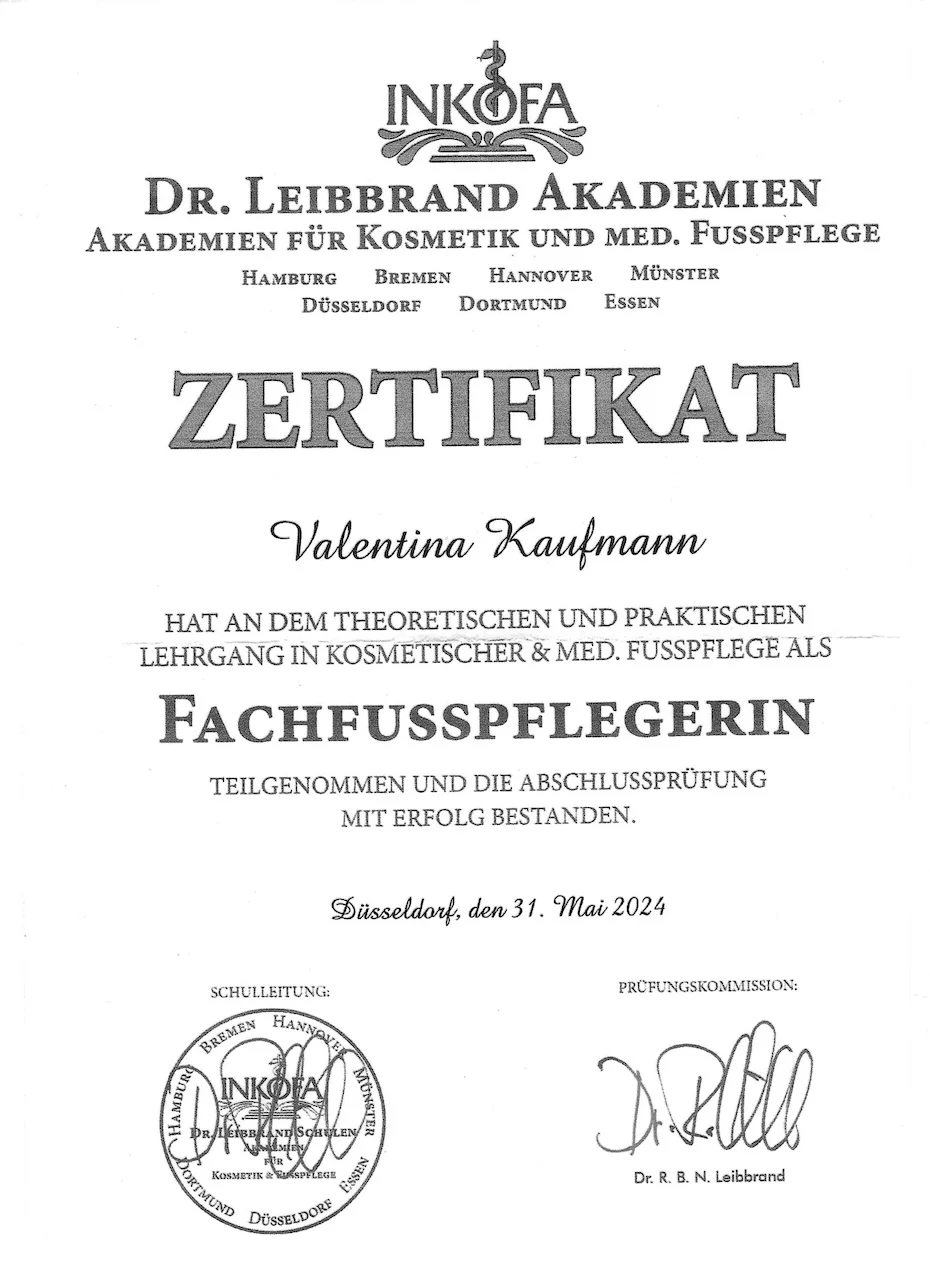 Frau Kaufmann hat erfolgreich eine zusätzliche Ausbildung in Kosmetischer & Med. Fußpflege zur Fachfusspflegerin erfolgreich absolviert.